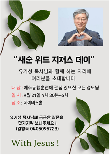 유기성 목사와 함께하는 새순 위드지저스데이 9월21일(주일) 오후4:30 데이비스홀 일시: 9월 21일(토) 오후 4:30 - 오후 6:00 장소: 데이비스홀 대상: 예수동행훈련에 관심 있으신 모든 성도님 문의: 김형옥 권사(0405 095 723)