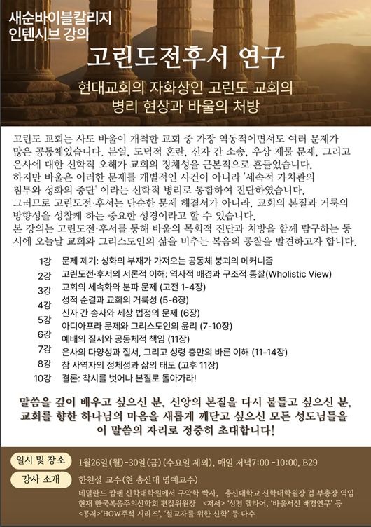 - 강사: 한천설 교수(전 총신대학교 부총장 겸 신학대학원장)