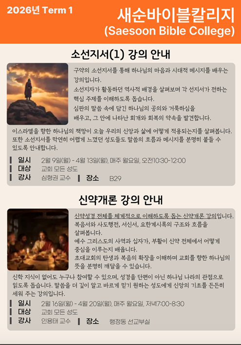 - 신약개론(인용태 교수) 2월 16일(월)부터, 저녁 7:00 ~ 8:30, 행정동 선교부실 G07