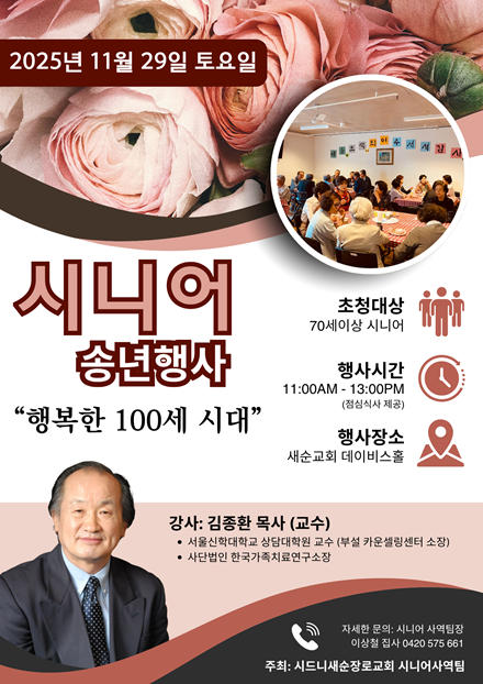 시니어 송년행사 ‘행복한 100세 시대’ 일시 및 장소: 11월 29일(토) 오전 11:00 ~ 오후 1:00, 데이비스홀 강사: 김종환 목사(서울신학대학교 상담대학원 교수, 사단법인 한국가족치료연구소장) 대상: 70세 이상 시니어 성도 점심식사 제공